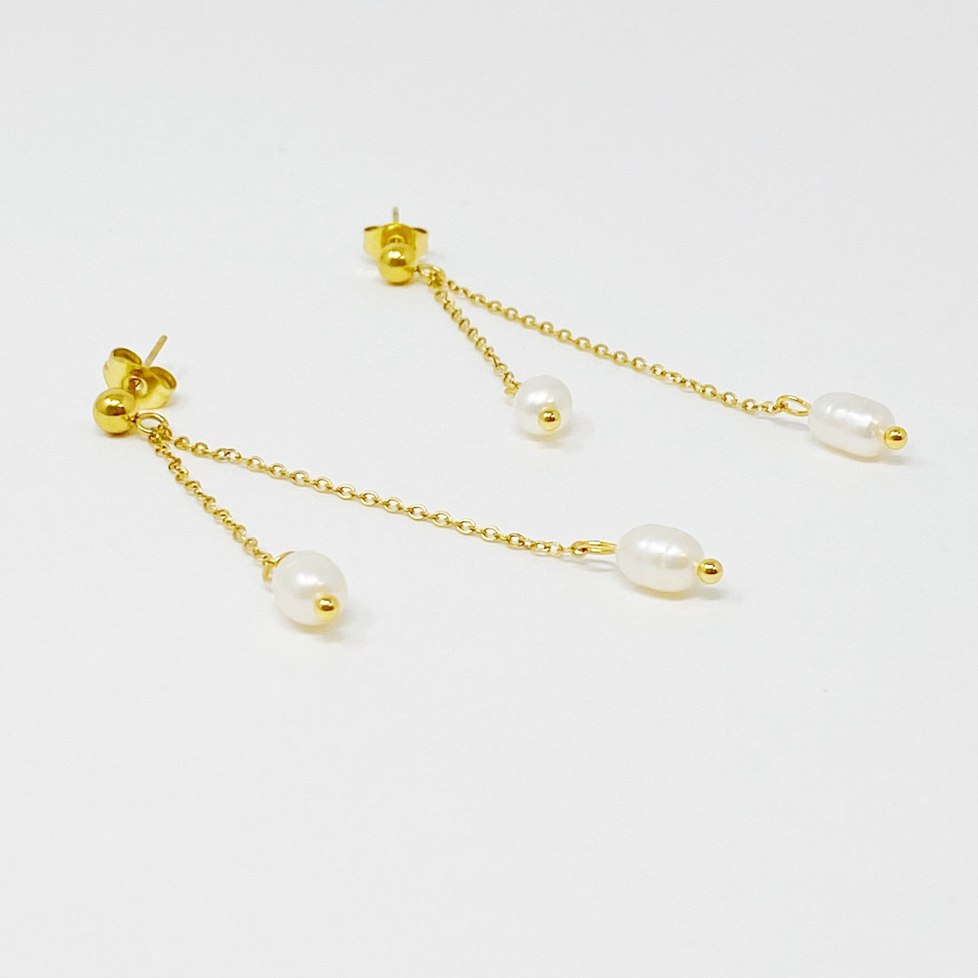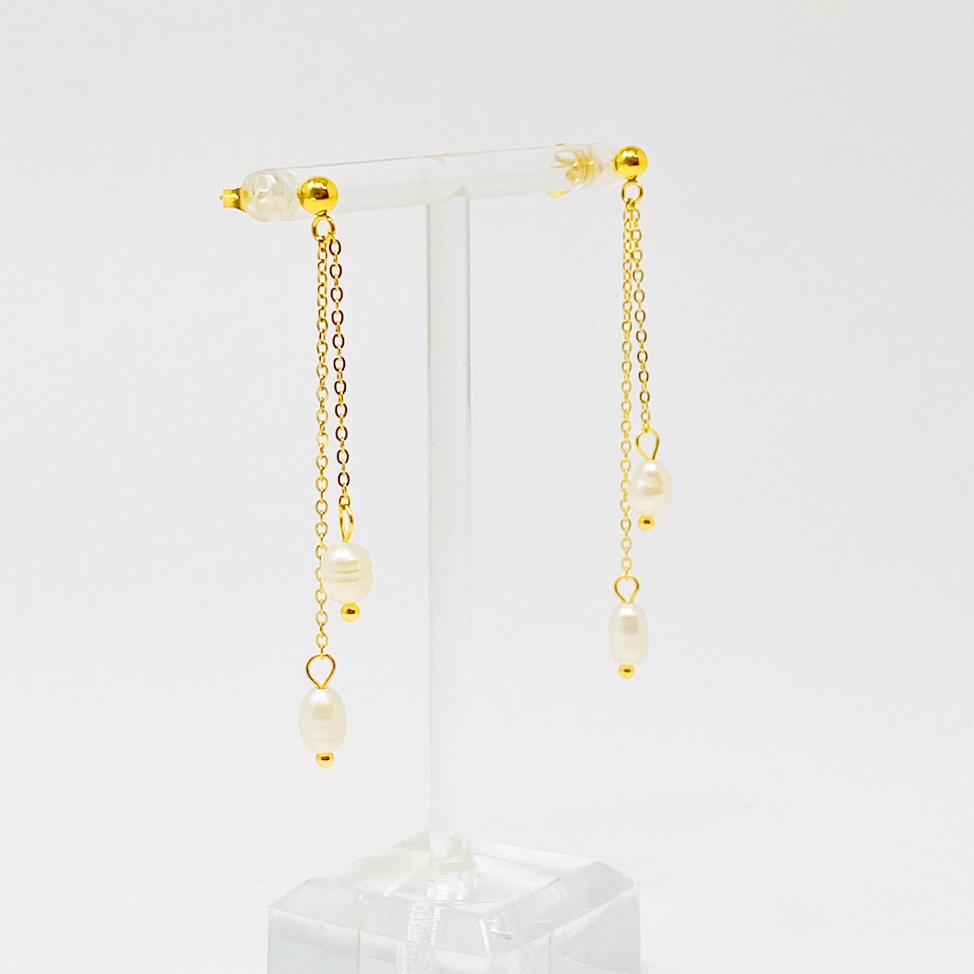 Long chain strands with 2 freshwater pearls. Beautifully dangles and great for everyday and any occasions!