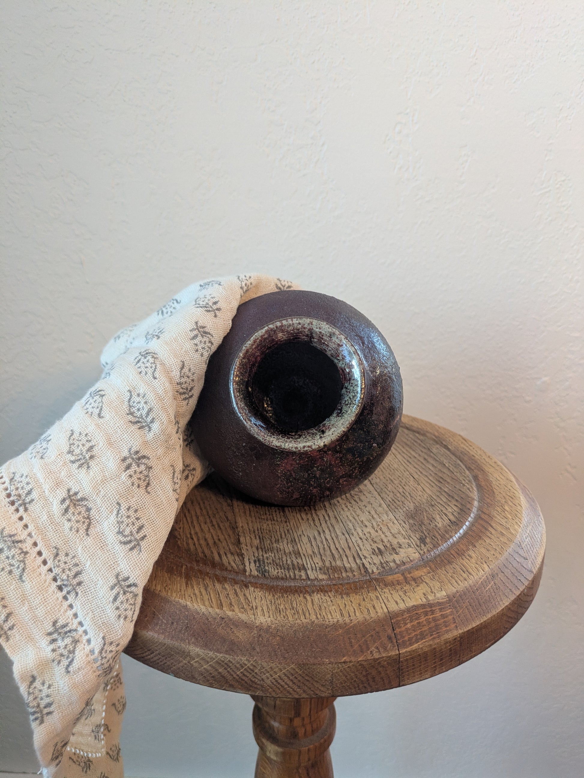 Handmade textured ceramic vase with glaze of dark tones of reds and blacks