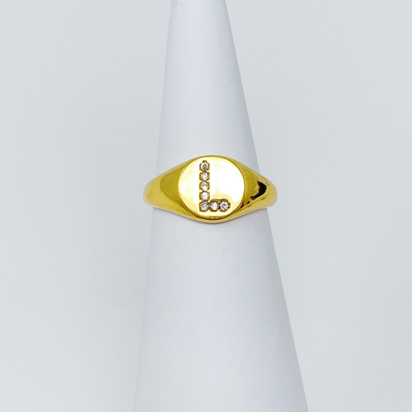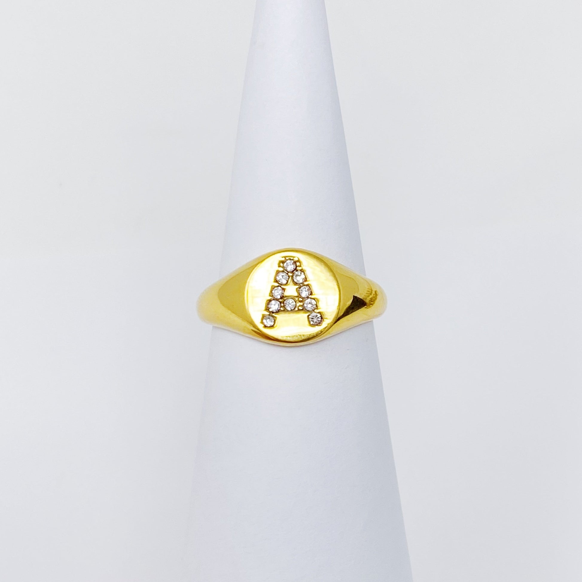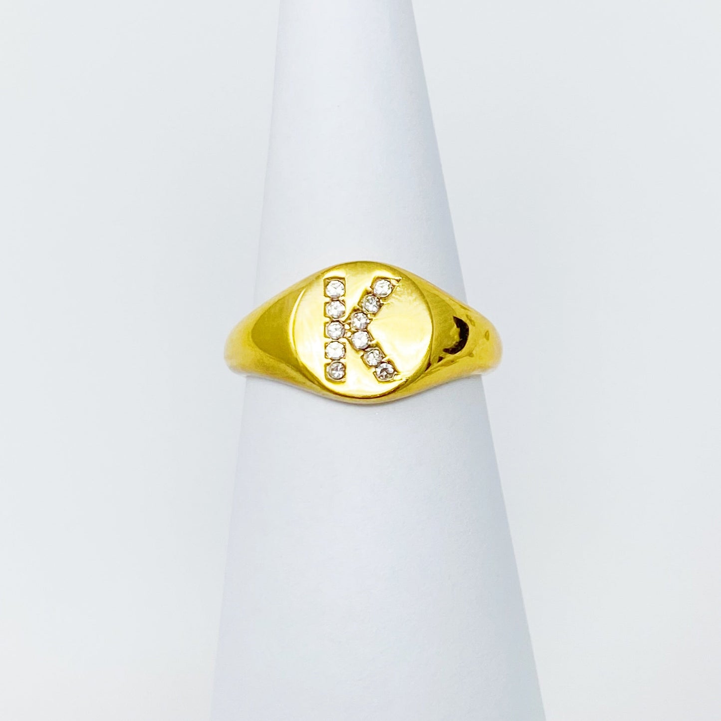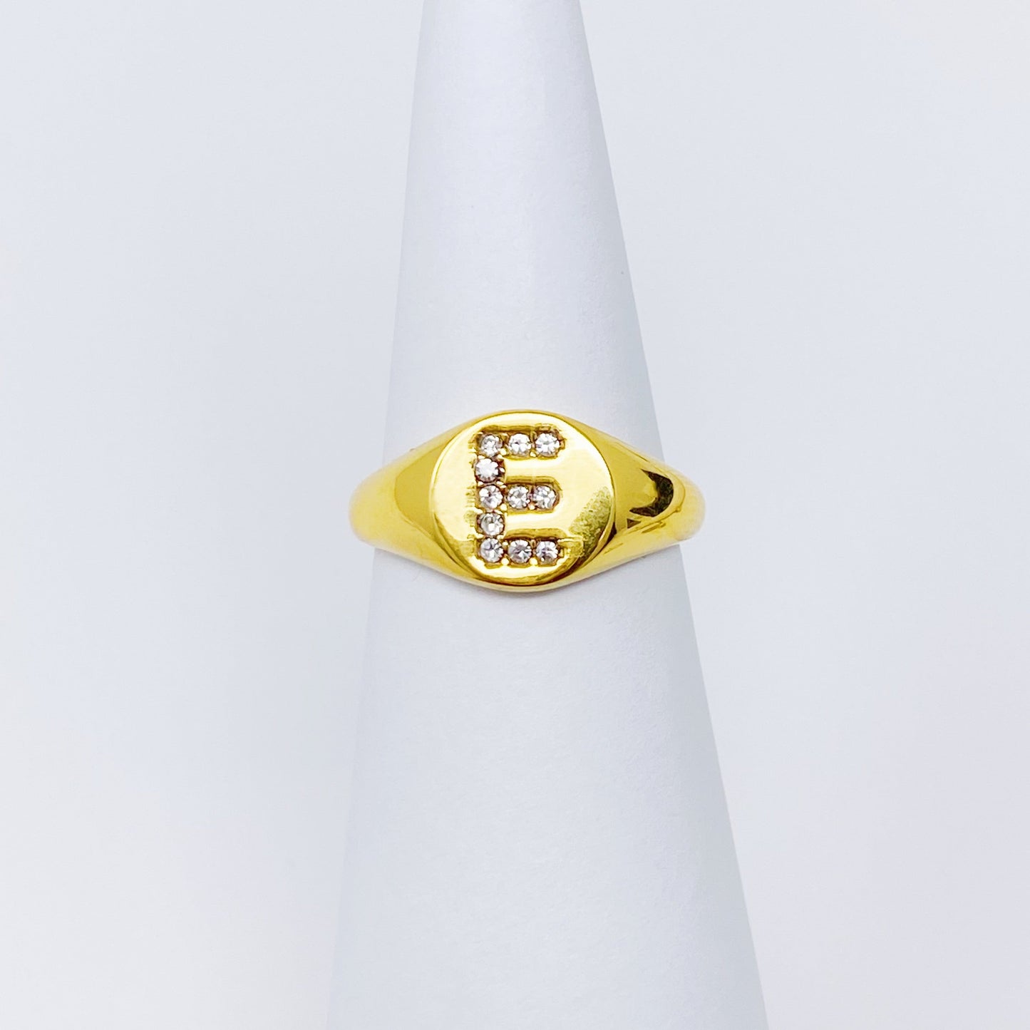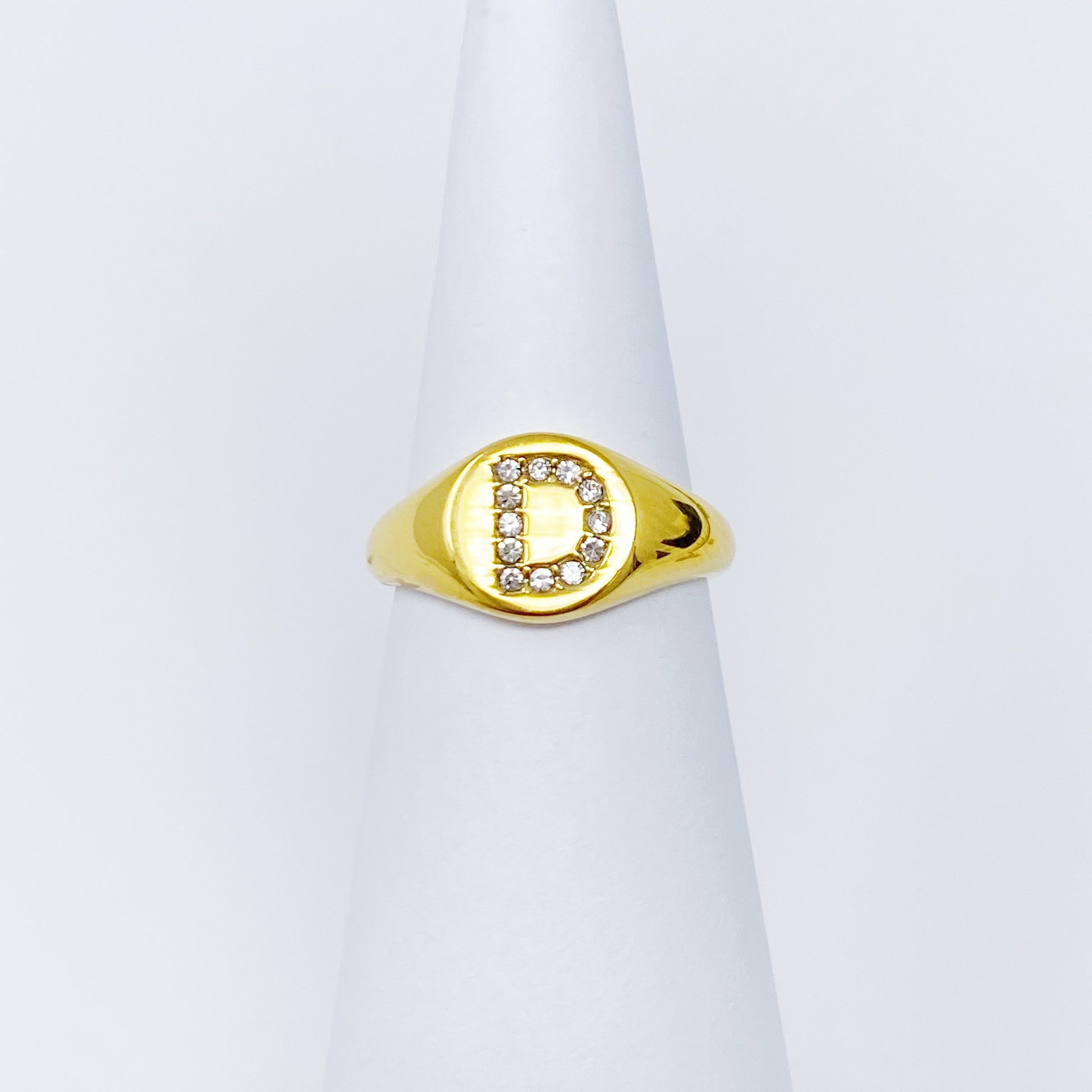 Stylish bold gold ring with initial paved with shiny CZ stones.
