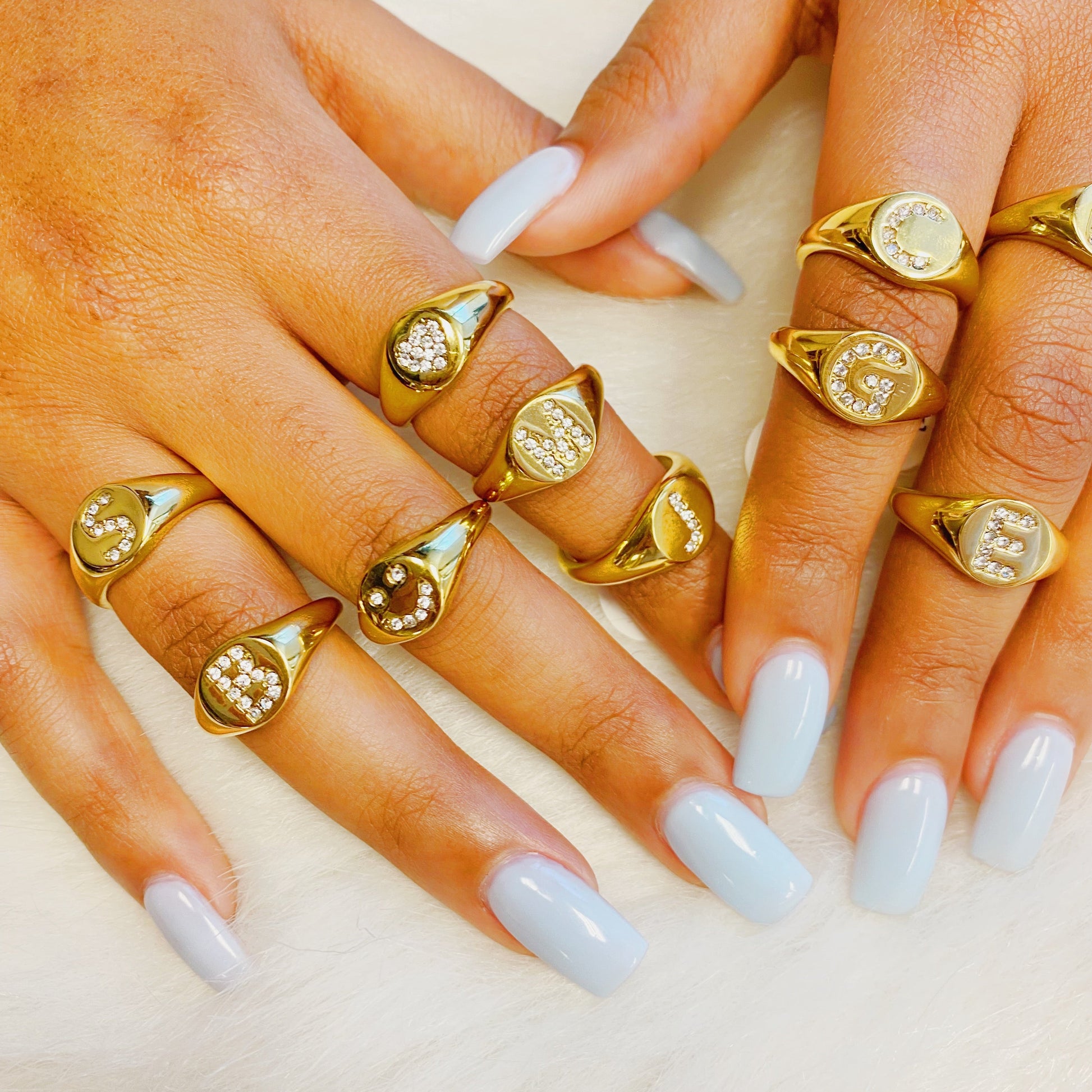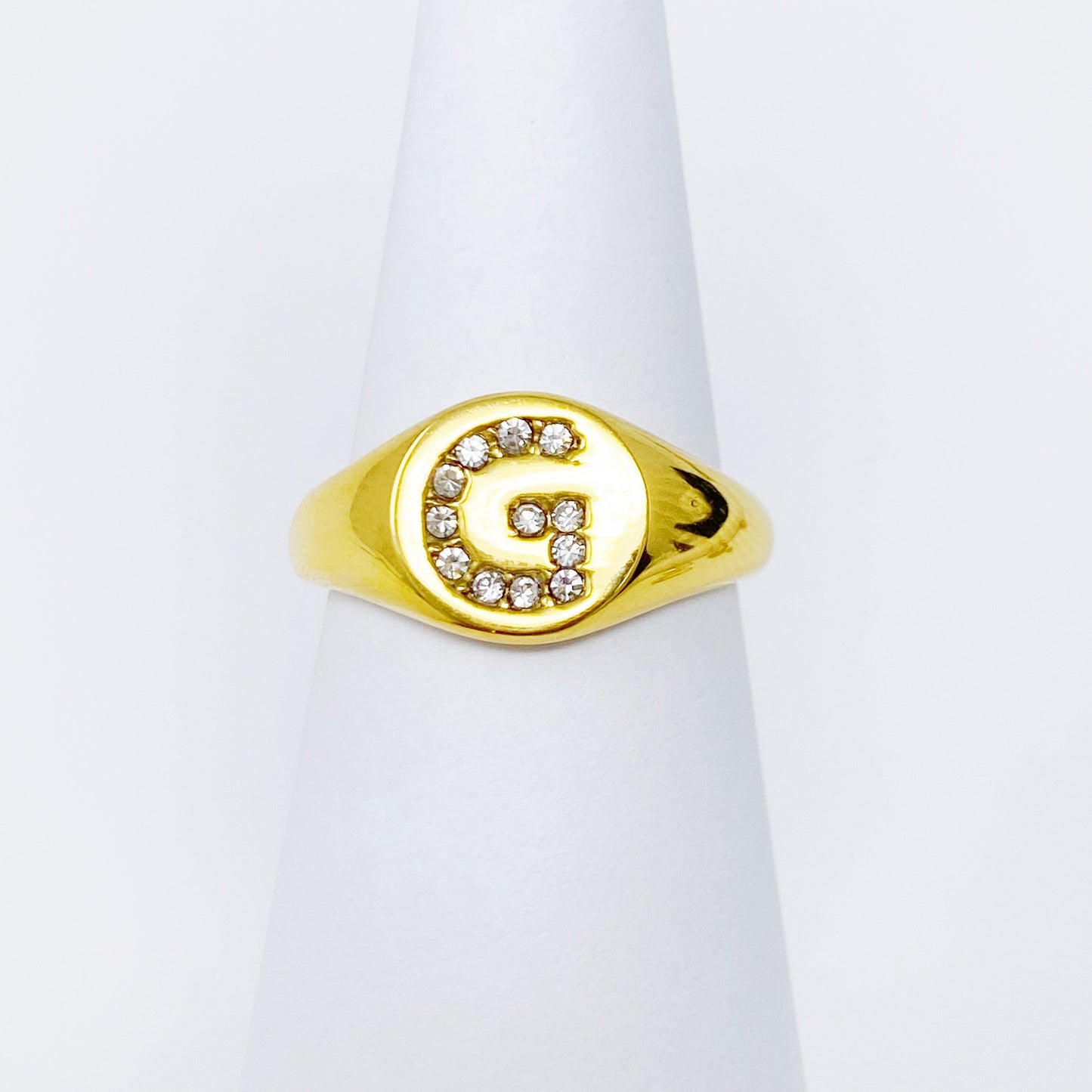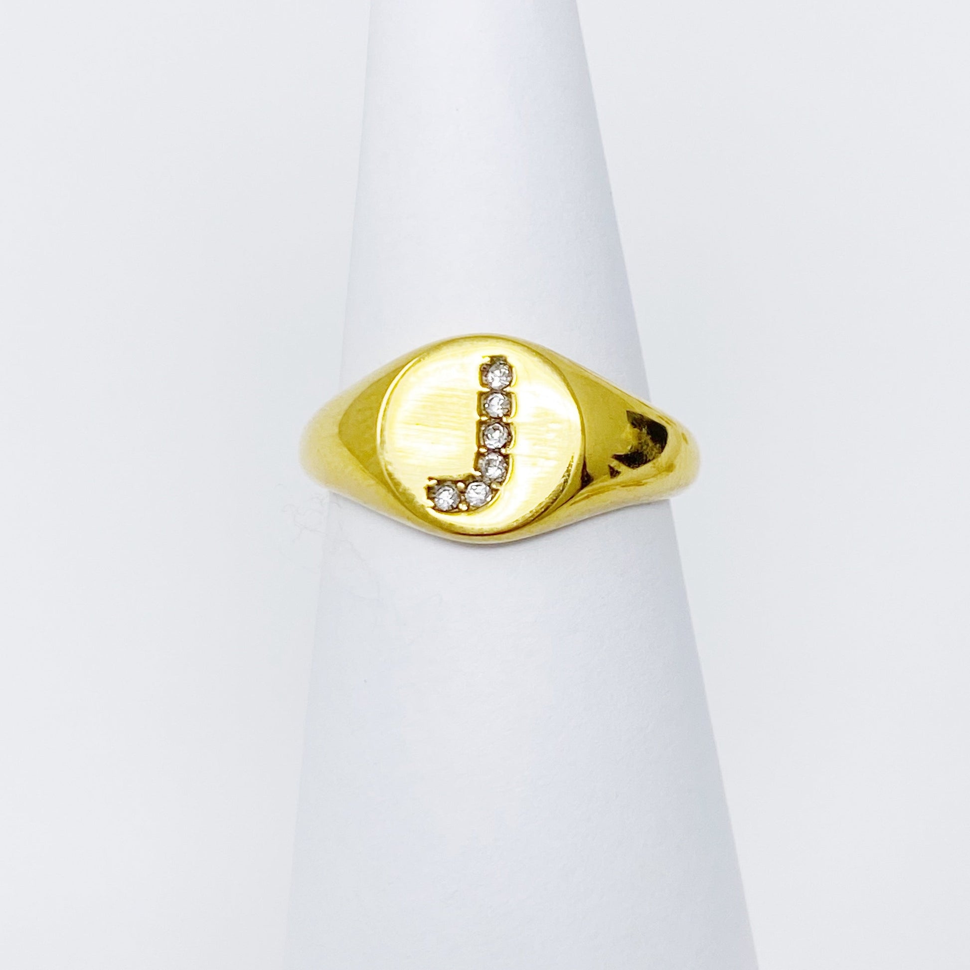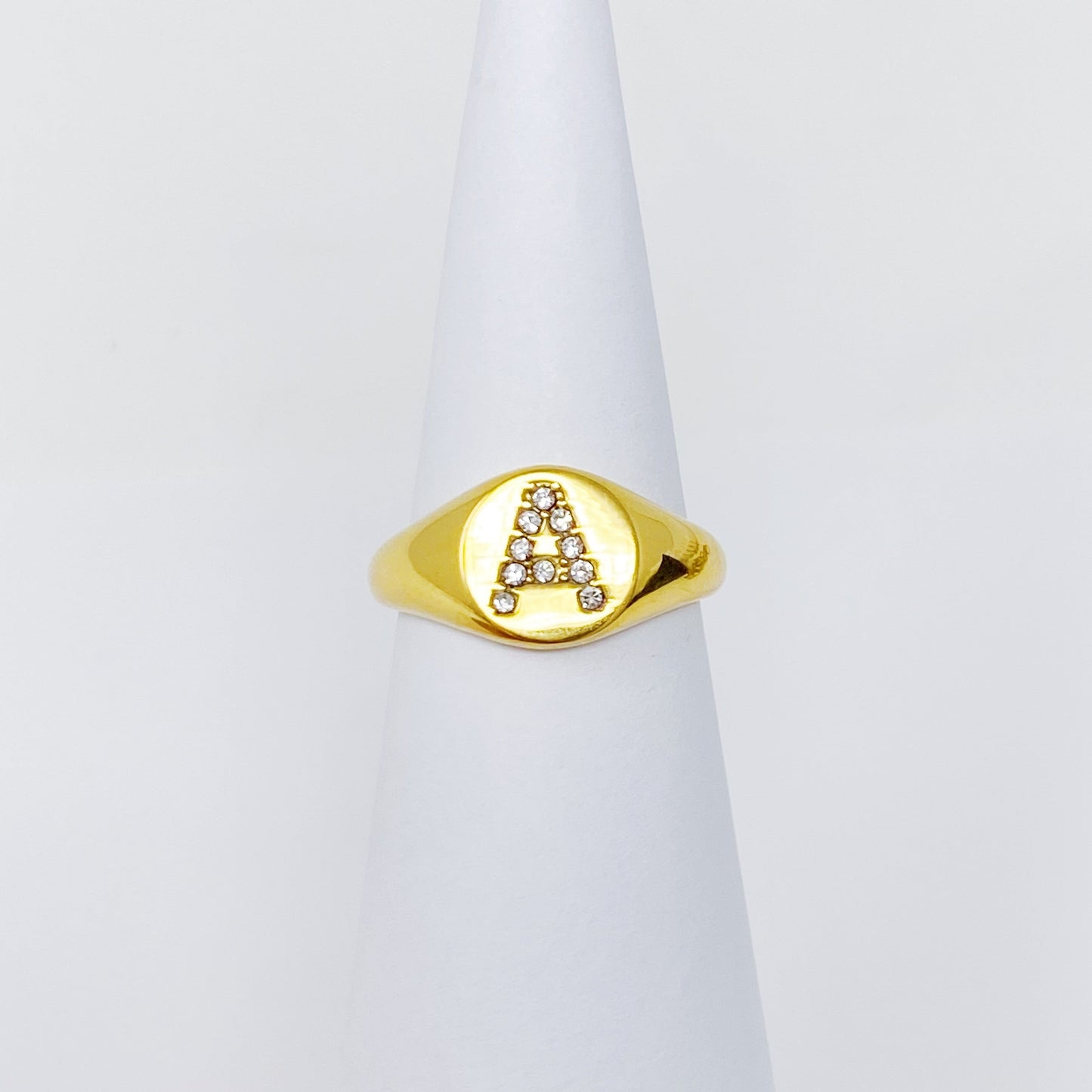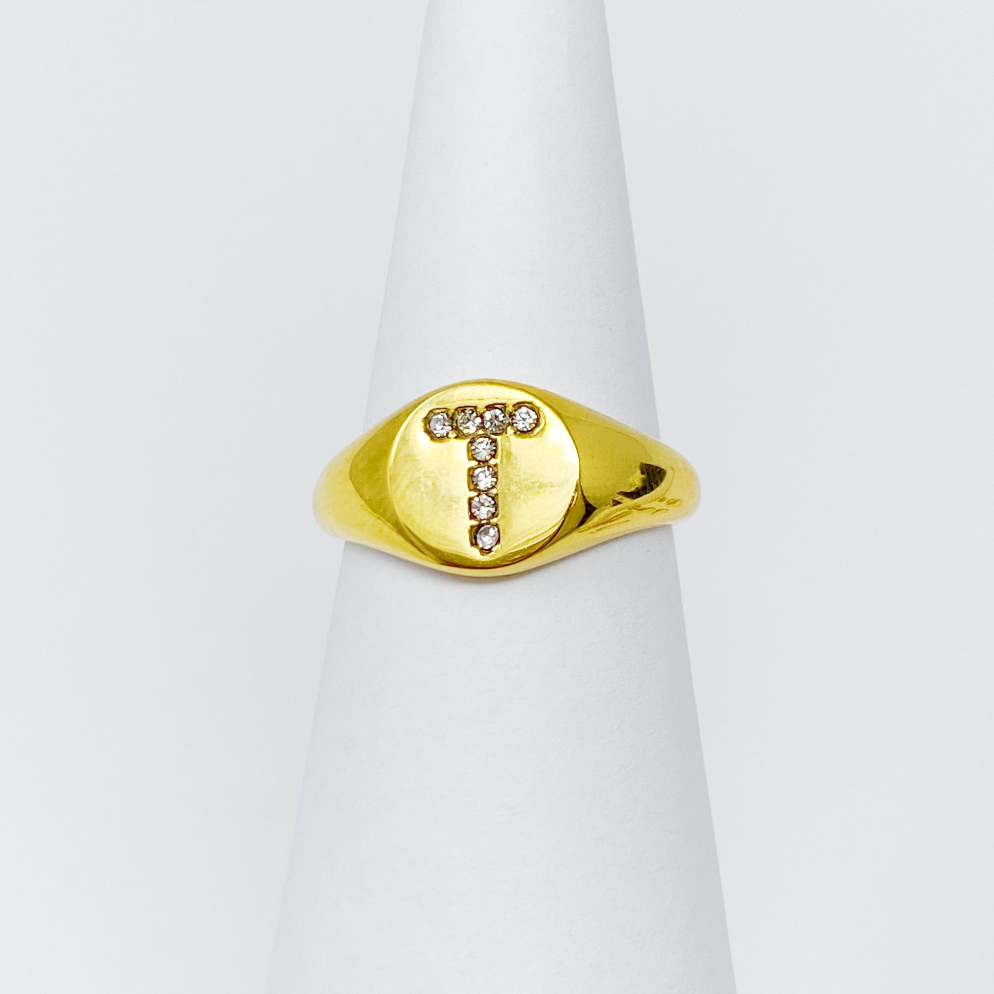 Stylish bold gold ring with initial paved with shiny CZ stones.