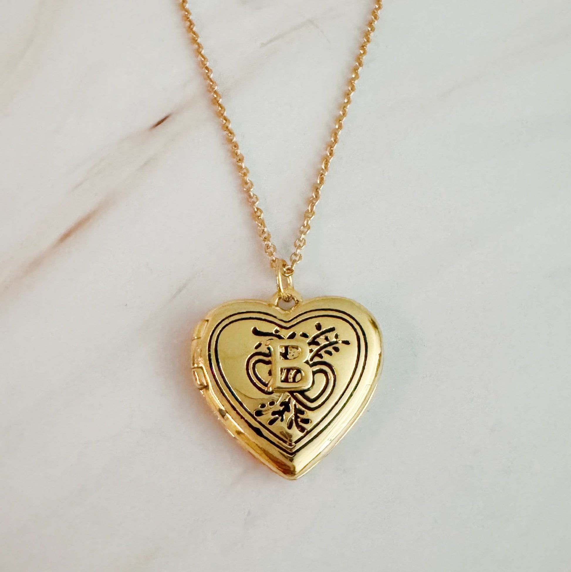 This engraved heart shaped initial locket necklace adds a touch of vintage charm to any outfit. The heart-shaped locket is perfect for everyday wear and can be layered with other necklaces for a unique look.